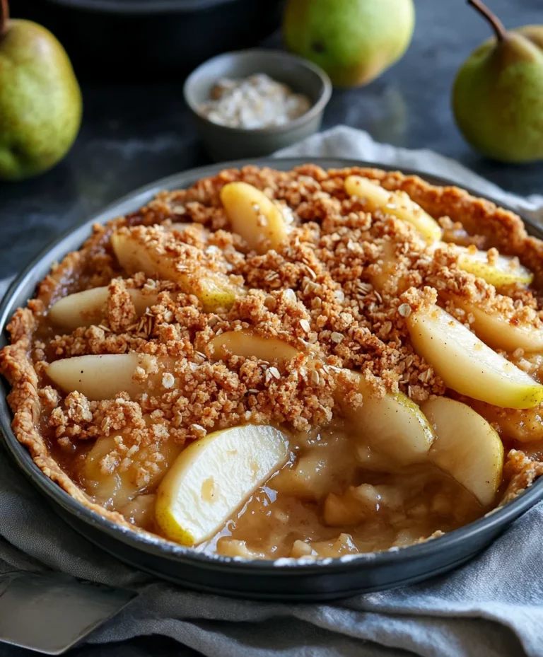 Enjoy this Fresh Pear Crumble Pie as a splendid end to a meal or a sweet afternoon treat. The combination of juicy pears and a rich, oat crumble topping makes every slice of this pie a delightful dessert experience, especially when served warm with a scoop of vanilla ice cream or a dollop of whipped cream.